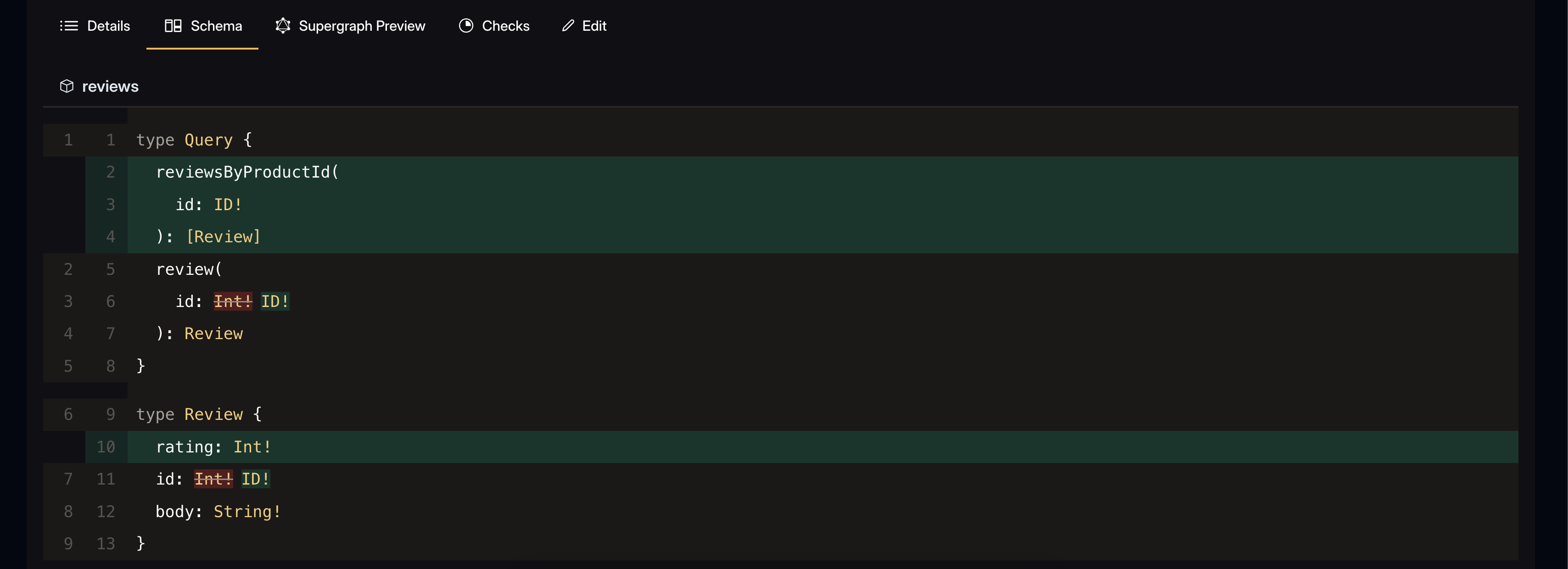 Showing a diff of the schema definition language (SDL) gives a clear picture of what your schema will look like. For this view, we opted to not using existing string diffing options that are typically used. This helps keep te rendered diff concise since we can control formatting and ordering to avoid unnecessary noise for example, when changing the order of definitions in your SDL.